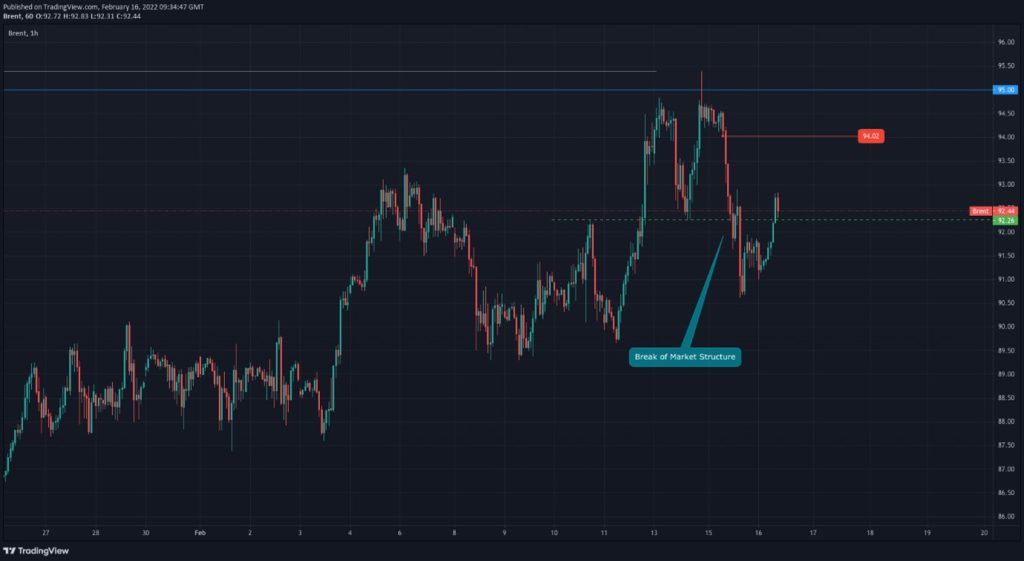 While tensions between Russia and Ukraine seem to be easing, oil prices remain elevated, hovering around $93 per barrel in Brent. There has been an intraday break of the market structure, which is showing an element of weakness. Profit-taking is likely the cause, but momentum could now build to the downside assuming the $94 level acts as solid resistance.