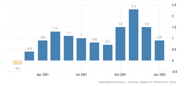 China’s consumer price index eased to 0.9% y/y from 1.5% in December, while producer price inflation eased to 9.1% y/y from 10.3%. This is the second consecutive month of decreased inflation. Which to my understanding means that they can export deflation back to the USA over the long term should this trend continue.