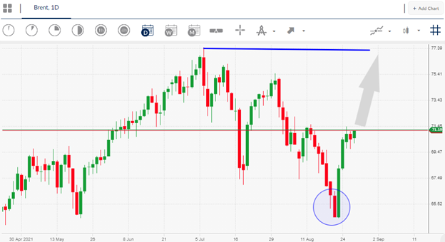 Brent crude oil has been staging a big rebound above the $70.00 resistance level as concerns about global demand started to ease while a major outage in Mexico support higher oil prices.