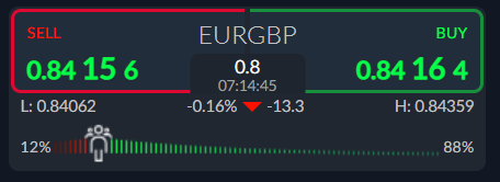 The ActivTrader platform shows that bullish sentiment is ramping up, with some 88 percent of traders still expecting more upside in the EURGBP pair. One-way sentiment skews are rarely correct, so the current bullish sentiment is worrying.