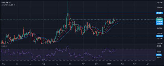 The EURGBP rose by +0.16% on Monday following BoE Governor Bailey’s speech. The Pound was downbeat as investors priced in a softer tone on monetary tightening by the BoE. Although 65% of money markets are pricing a 50bps hike on the next BoE meeting, there remains a 35% chance of a 25bps hike which could increase as UK inflation data is set to drop to 10.5% from a previous reading of 10.7%.