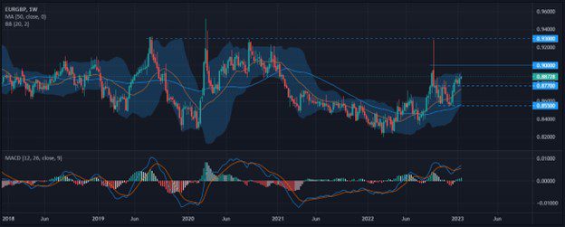 However, a break below the 0.8770 level coinciding with a Bollinger band Baseline could cause a short-term retracement towards the 0.8550 level. A failure to defend the 0.8550 level could invalidate the current outlook and bears could take over the trend.