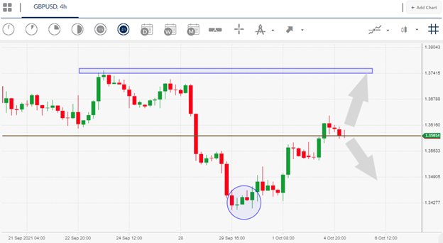 Looking at the four-hour time frame, the GBPUSD pair has formed a large, inverted head and shoulders pattern, which suggests that a bounce back towards the 1.3600 resistance level could be coming.