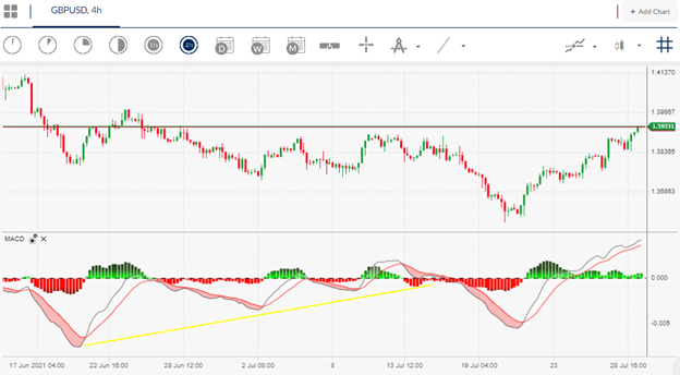 Looking at the four-hour time frame, the GBPUSD pair has significant amount of bullish MACD price divergence which appears to be unwound now a meaningful price floor has been established.