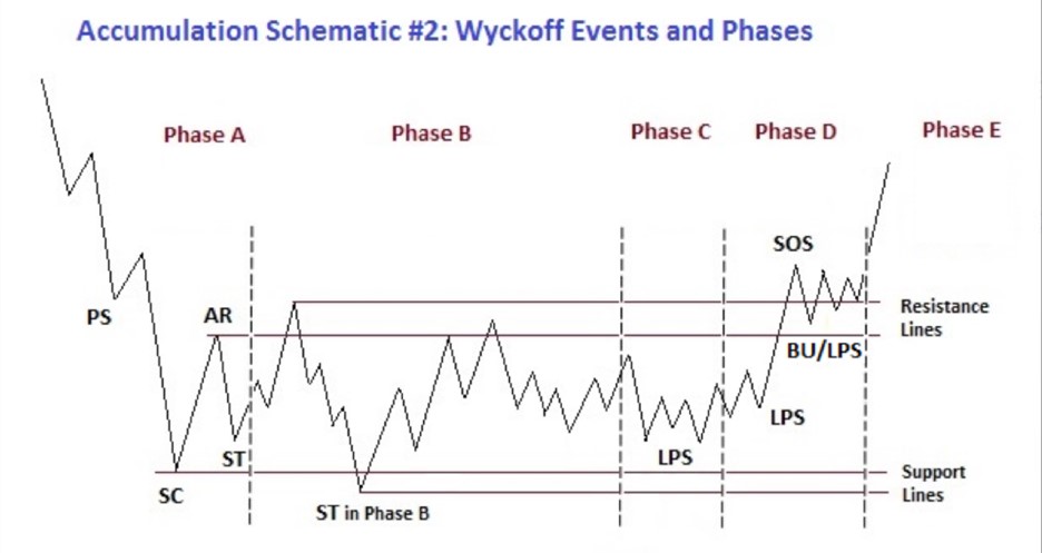 As I mentioned last week technical analysis is currently showing that a Wyckoff accumulation pattern may is forming over the lower time frames. It now looks almost certain that a Phase 2 Wyckoff accumulation schematic method is playing out.
