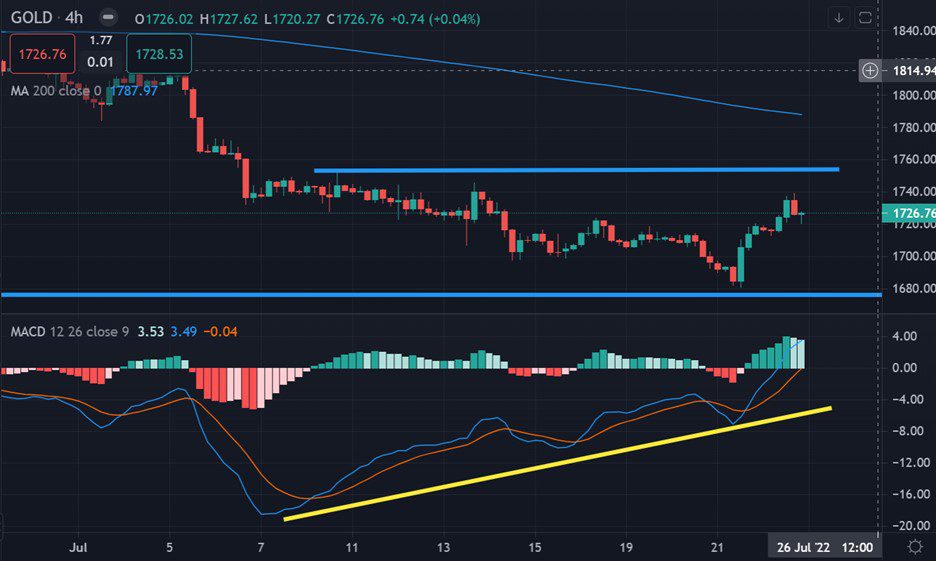 Looking at the MACD price divergence, we could see the price of gold rallying towards the $1,750 level if the positive MACD price divergence starts to unwind. While the mentioned pattern projects a coming move towards the $1,790 area.