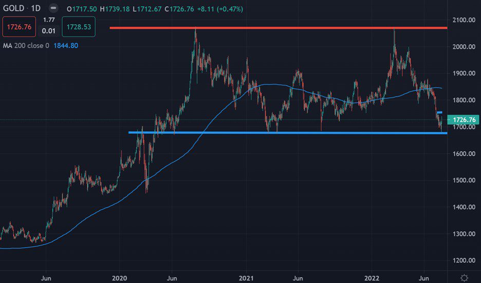 The daily chart shows that gold has now officially tested and rebounded from the bottom of its price range. As you can see the top of the range is basically $2,050, while the bottom is slightly below $1,700.