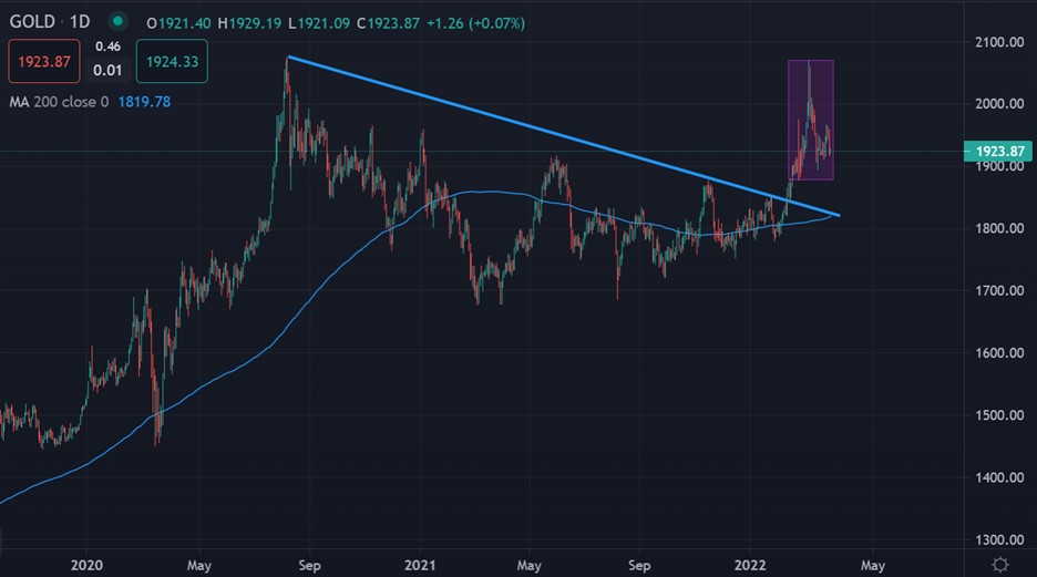 Perhaps the clue to where gold heads next is found on the price chart, and the former key breakout zone where gold first starting to ramp higher towards its recent multi-month high, at $2,060.