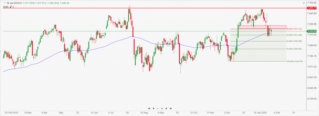 Elsewhere investors will keep an eye on today’s BoE meeting, the last one before the UK formally exits the EU. This meeting is likely to increase volatility towards GBP assets as the outcome, with a 50% chance of a 0.5 basis point cut, remains very uncertain to investors. While the impact of this anticipated meeting has already had a negative impact on Sterling this week, it could give a solid mechanical boost to UK shares. So far, the FTSE-100 Index is flirting with the 7,450pts level after rebounding over the 7,410pts zone. However, the market will have to clear the resistance zone at 7,475pts–7,510pts in order to reach previous highs towards 7,700pts and beyond.