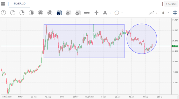 Interestingly, things are starting to change. The ActivTrader market sentiment tool now shows that around 72% of traders are bullish towards the price of silver, marking close to a 20 percent weekly price drop.