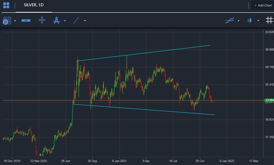 According to technical analysis silver could be headed towards the $31.50 level if bulls are able to hold to level. A break above the defend the $21.80 level. A move towards the top of the triangle would be huge for silver bulls.