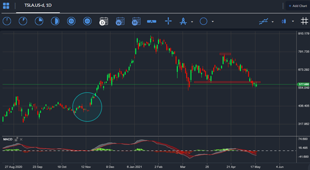 Elon’s Musk’s Twitter feed could also be a problem for Tesla bulls. Musk has been putting a series of cryptic Tweets, which appeared to put the electric car makers Bitcoin holdings into question.