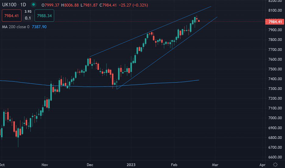 If we see the UK100 starting to move towards the top of a rising wedge pattern. This certainly hints that a correction could take place from at least the 8,100 area.