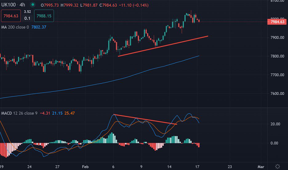 According to the MACD indicator on the four-hour time frame the UK100 has started to form huge layers of bearish MACD price divergence.