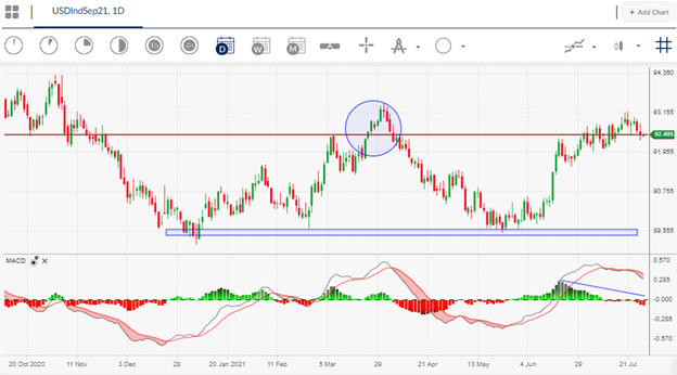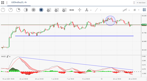 Bearish price divergence has also formed during on the Relative Strength Index and is warning that the July gains could quickly unravel at any moment unless the 93.00 level is breached.